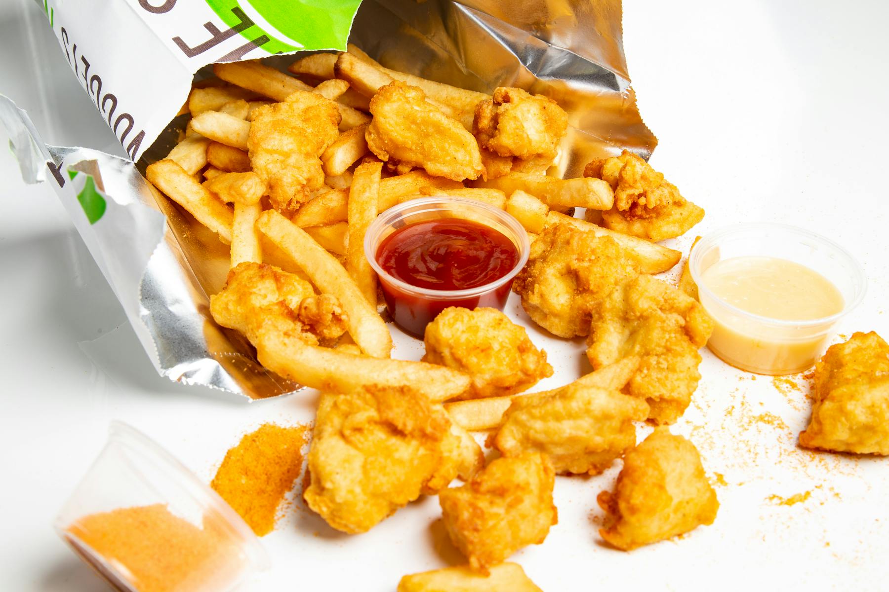100 white meat chicken with NO antibiotics ever hand-cut daily and cooked to perfection. Cauliflower Nuggets - 14 LB. Comes with a 1LB of Crispy Cauliflower Nuggets a portion of fries and served with a free soda.